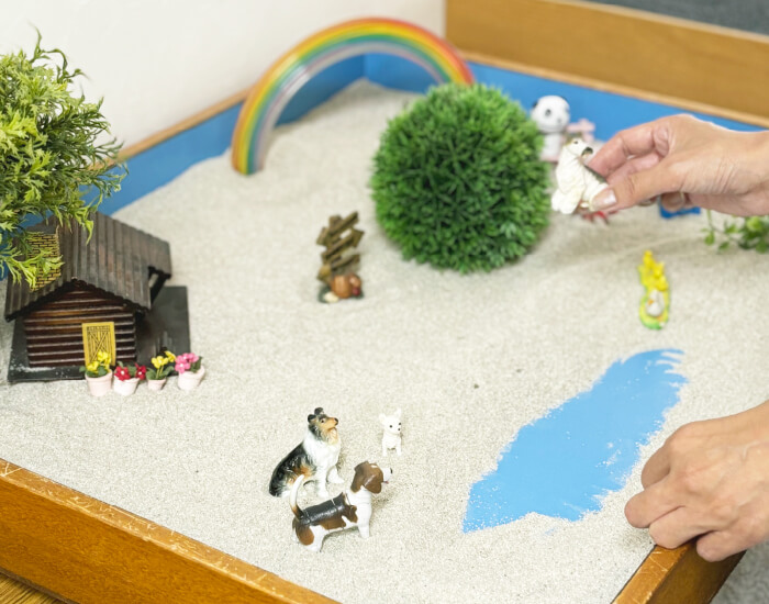 ミニチュアの玩具を使って、砂箱の中に表現をしていく心理療法です。