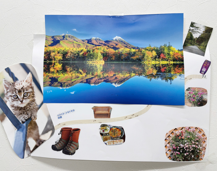 お気に入りの、あるいは、気になってしまう写真や絵・文字等自由に切り抜いて、のりづけしていきます。